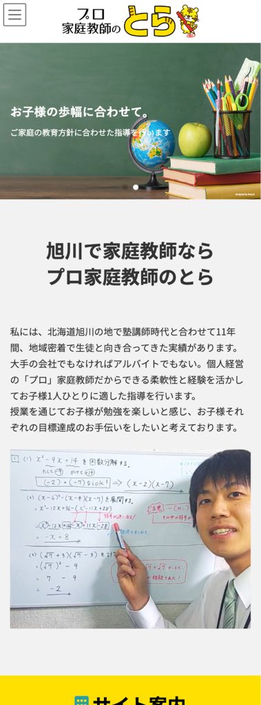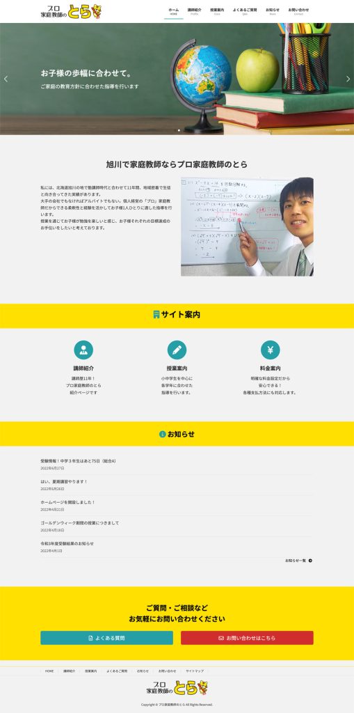 北海道旭川市で家庭教師として活動されている、プロ家庭教師のとら様のホームページを制作させていただきました。学ぶことが楽しみになるようなホームページを目指してデザインしています。